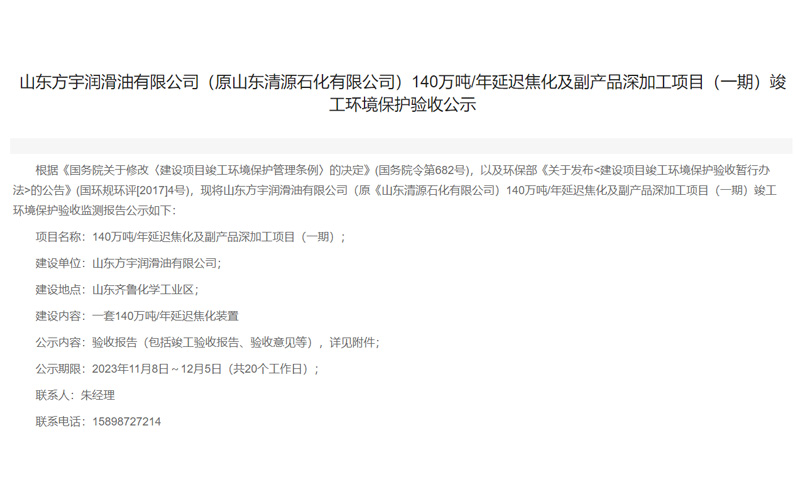 根據(jù)《國務(wù)院關(guān)于修改〈建設(shè)項目竣工環(huán)境保護管理條例〉的決定》(國務(wù)院令第682號),以及環(huán)保部《關(guān)于發(fā)布<建設(shè)項目竣工環(huán)境保護驗收暫行辦法>的公告》(國環(huán)規(guī)環(huán)評[2017]4號),現(xiàn)將山東方宇潤滑油